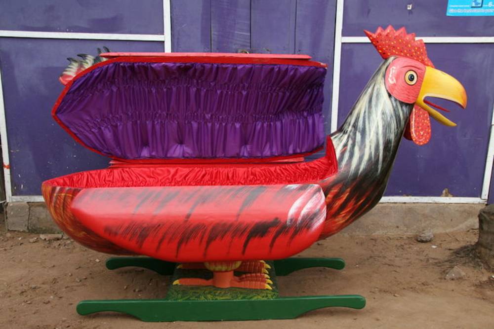 Au Ghana, en Afrique, les enterrements sont très importants et prennent la forme de grandes fêtes. Les familles sont prêtes à dépenser des sommes faramineuses pour les obsèques de leurs proches. Pour rendre hommage aux défunts, les cercueils des proches que l’on inhume sont customisés à l’image de ce dernier. Un fan de stylo Bic peut avoir un cercueil en forme de style BIC, un fan d’ananas peut avoir un cercueil d’ananas, et il existe bien d’autres exemples. Ces cercueils existent depuis plusieurs décennies mais ont été démocratisés dans les années 1950.